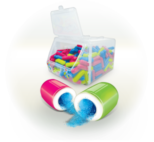 Složení: cukr, gumová báze, glukózový sirup; okyselující látka: kyselina citrónová, dextróza, příchutě; Zvlhčovač: glycerol; Emulgátor: slunečnicový lecitin; Protispékavá látka: fosforečnany vápenaté; Potahovací látka: šelak, včelí vosk, karnaubský vosk, olivový olej; Antioxidant: BHA; Barviva: barvy, E102, E162, E133, E129